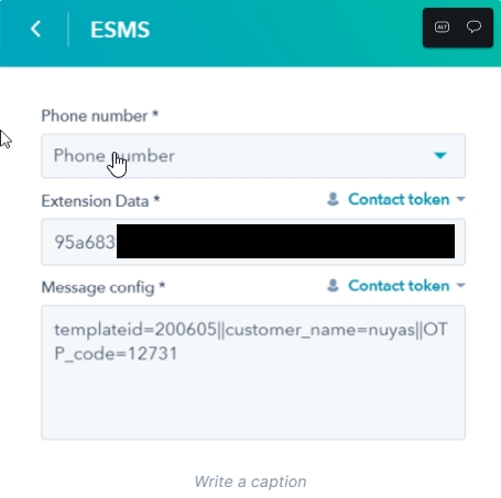 Sau khi bấm vào ESMS sẽ tới bước cấu hình tin nhắn. Ở bước này, Extension Data sẽ lấy được ở BƯỚC 2