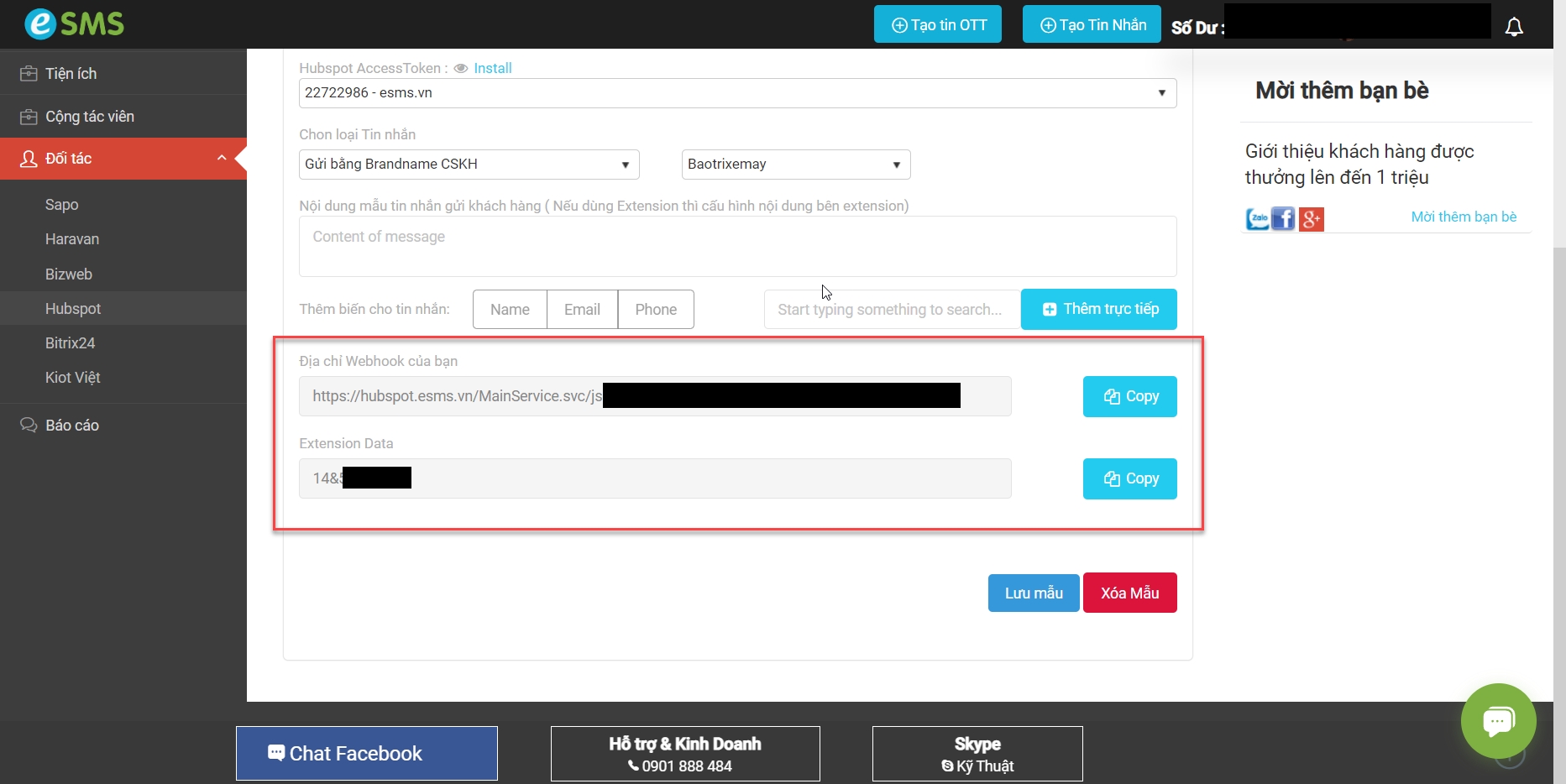 Sau khi bấm lưu mẫu thành công sẽ có được địa chỉ Webhook và Extension Data.