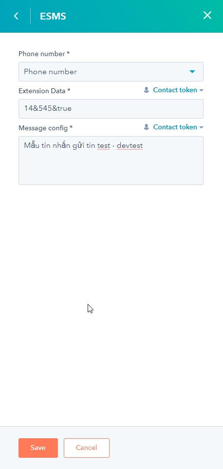Đối với tin CSKH: nhập full content đã đăng ký tương ứng với BrandName đã cấu hình ở eSMS vào Message Config. Các biến thay đổi thì bấm vào Contact Token để chọn biến -> Sau đó bấm Save.