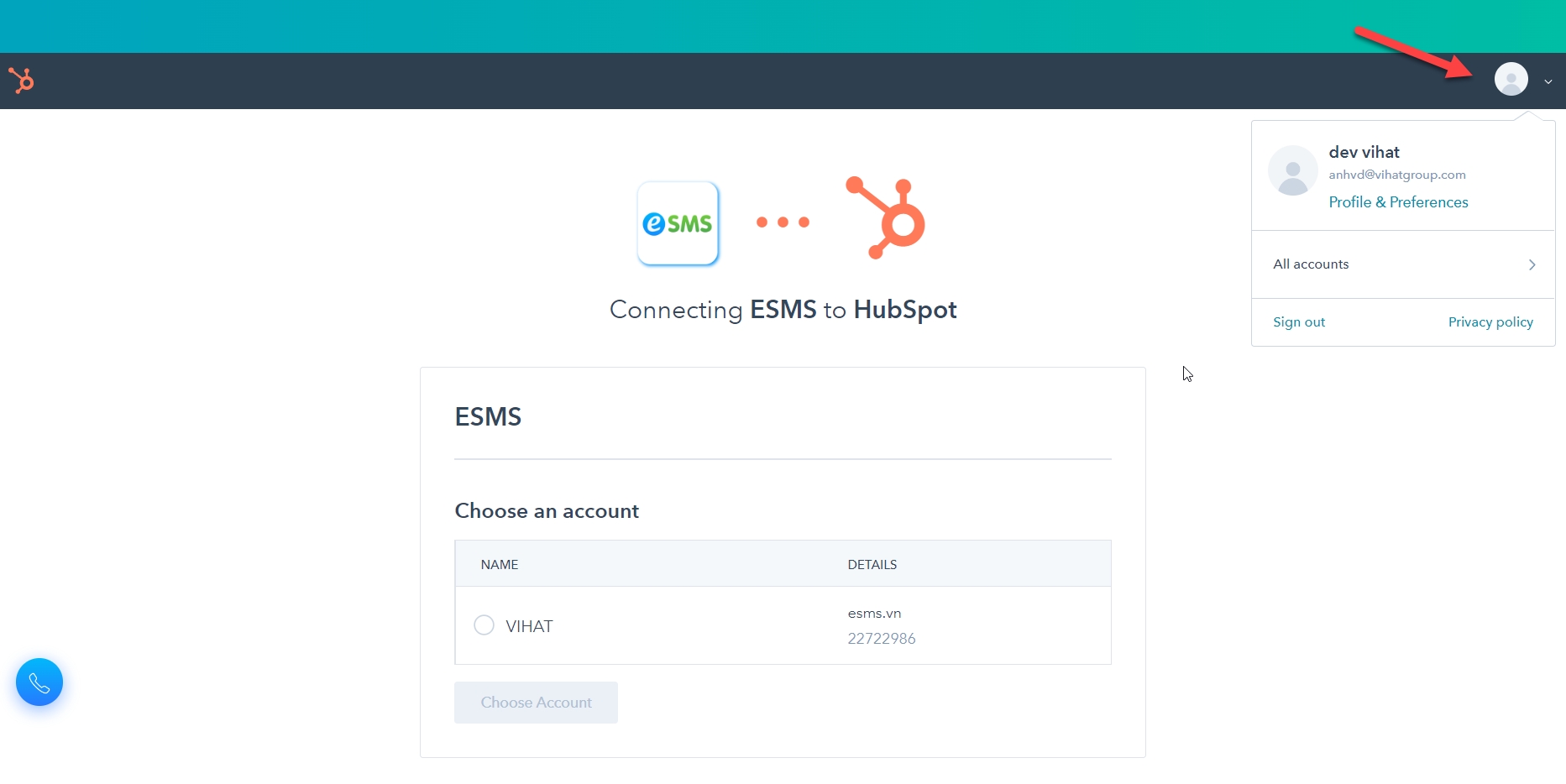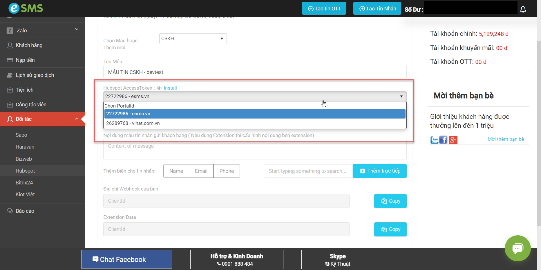 Đăng nhập tài khoản eSMS bằng domain https://account.esms.vn/Account/ApiInfomation?partner=hubspotv2