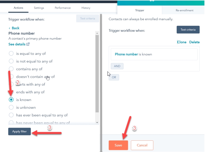 Bước 4: Cấu hình CONTACT ENROLLMENT TRIGGER để lấy được số điện thoại.