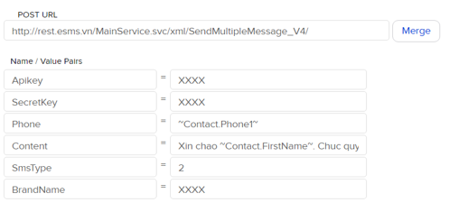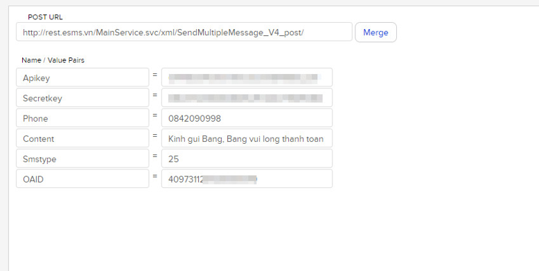 Post url : là đường dẫn API của eSMS. http://rest.esms.vn/MainService.svc/xml /SendMultipleMessage_V4_post/
