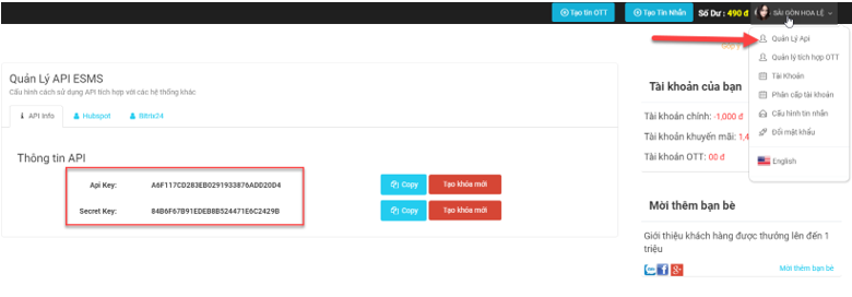 Apikey và SecretKey lấy được bằng cách login vào trang web esms.vn và nhìn lên góc phải màn hình sẽ thấy phần quản lý. (Manager API)