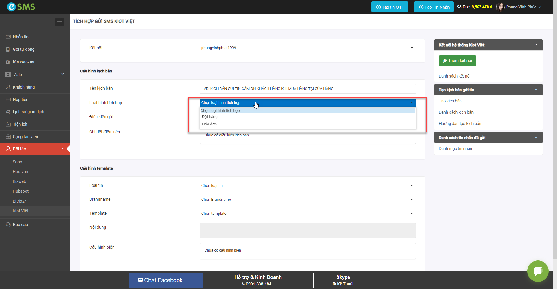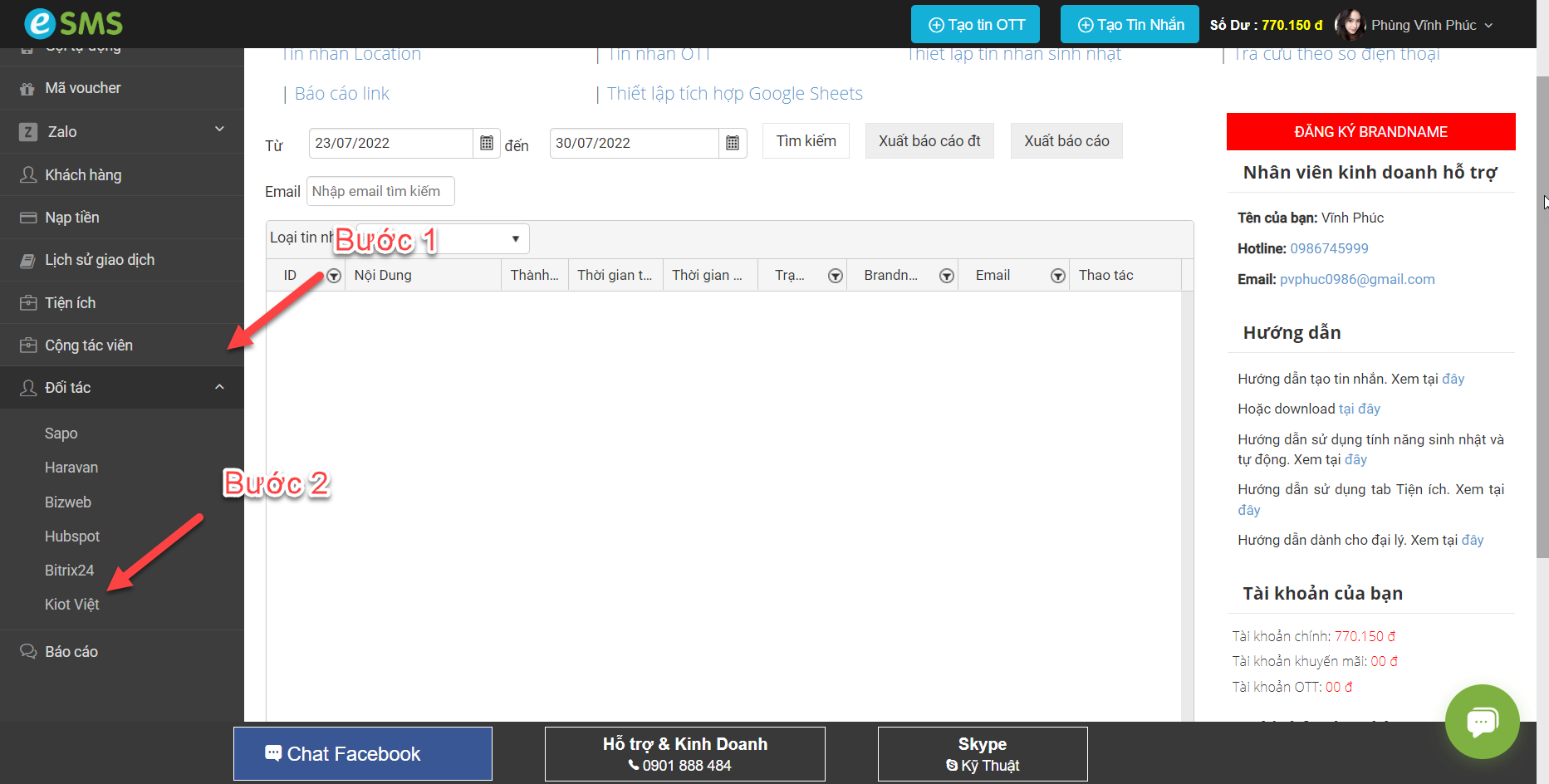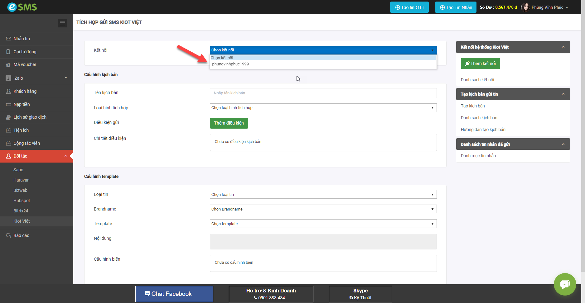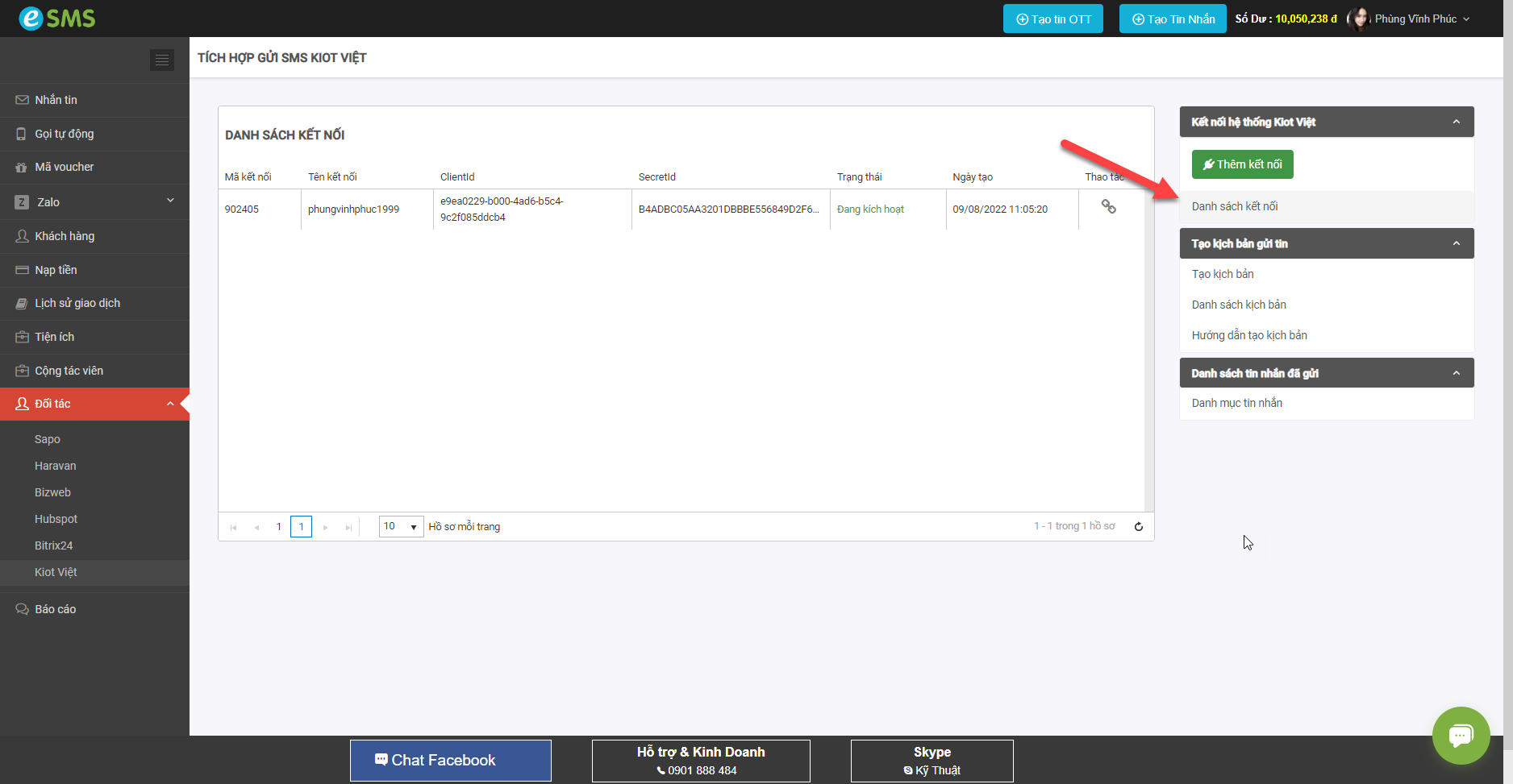Bước 2: Đăng nhập vào tài khoản eSMS đã liên kết -> Tab "ĐỐI TÁC" -> Chọn KIOT VIỆT.