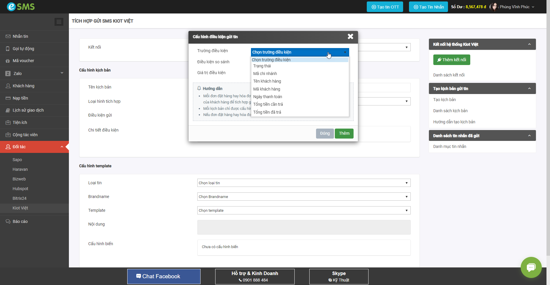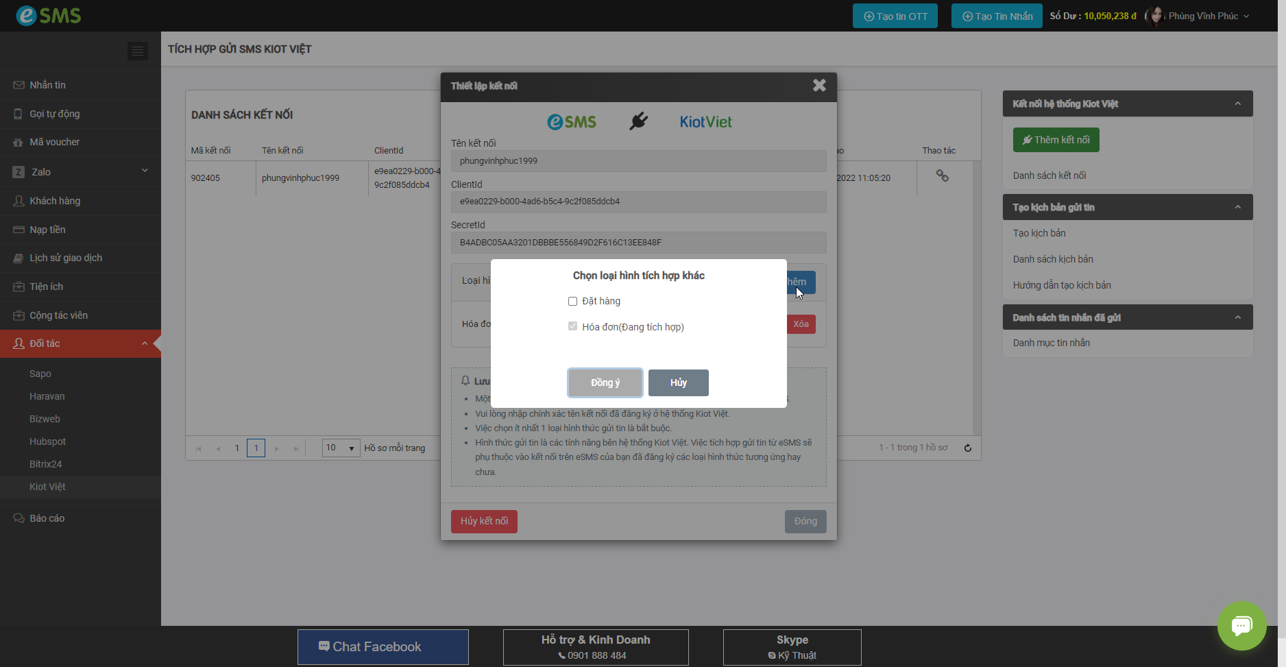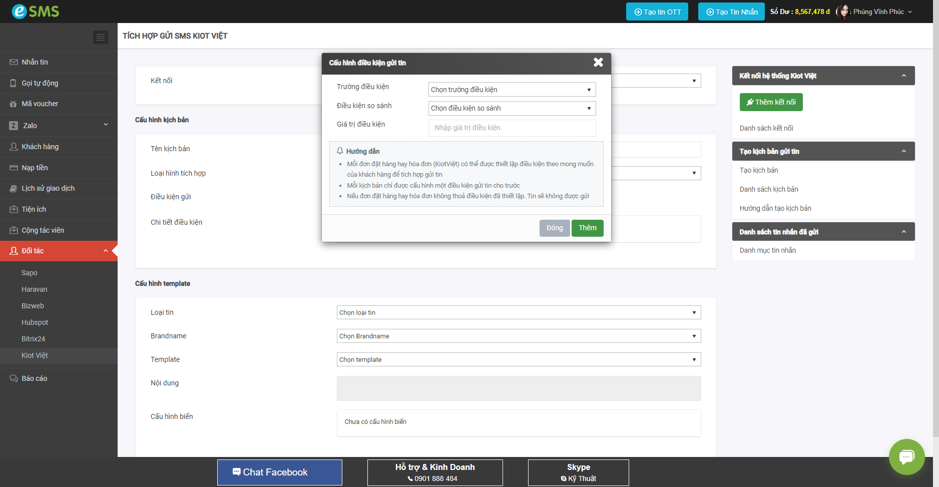 Bước 2: Đăng nhập vào tài khoản eSMS đã liên kết -> Tab "ĐỐI TÁC" -> Chọn KIOT VIỆT.