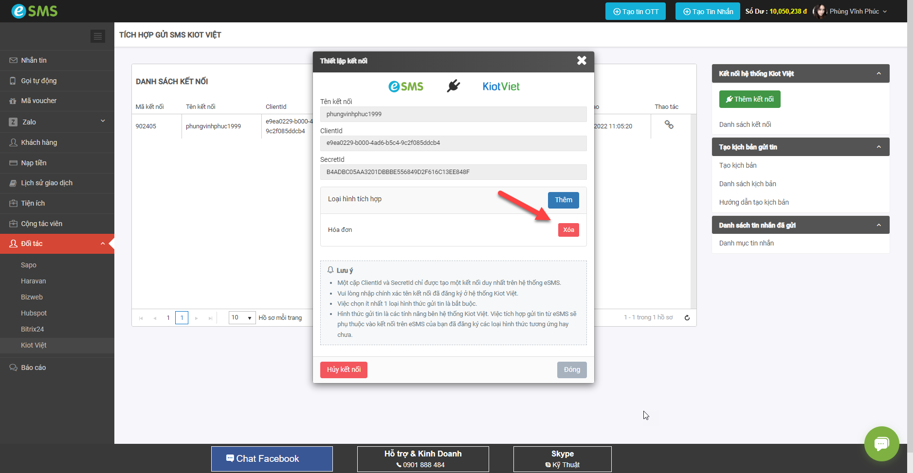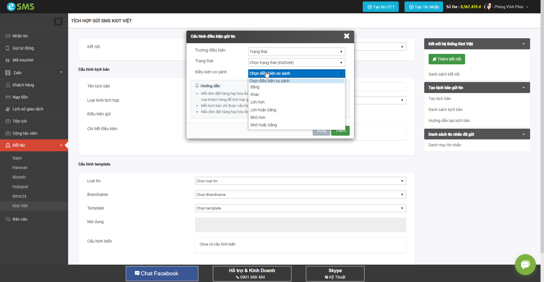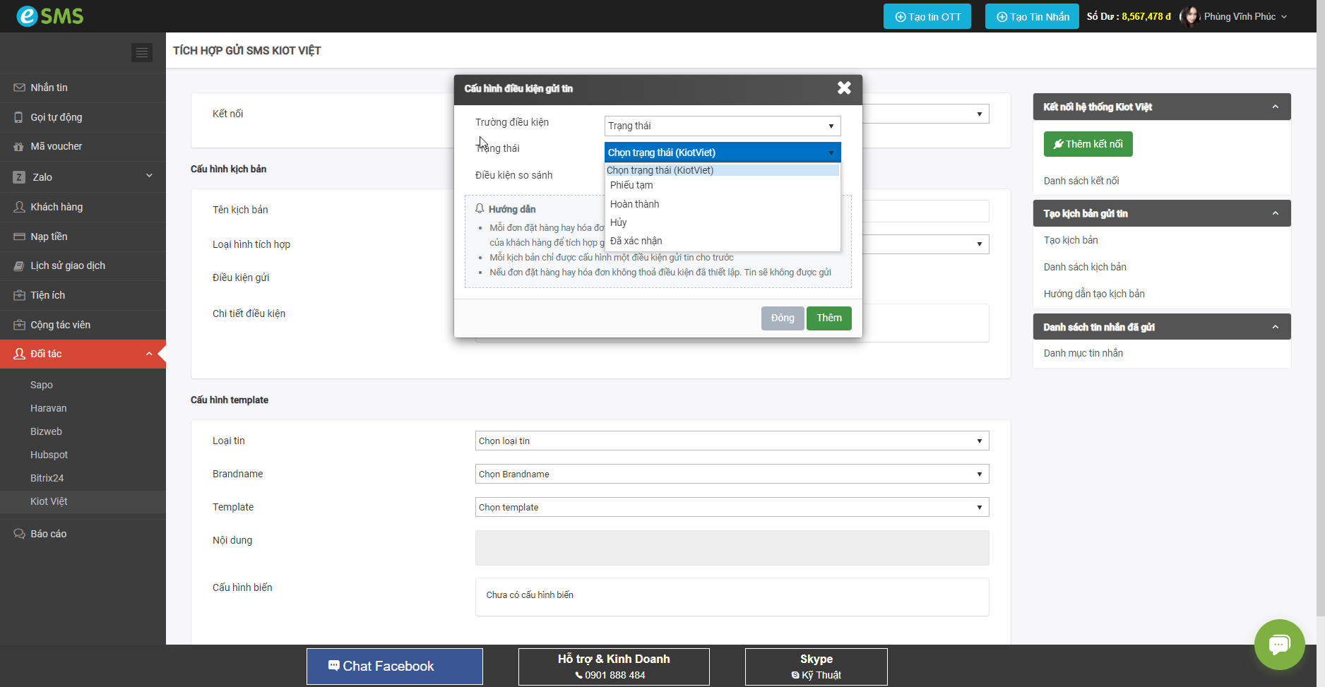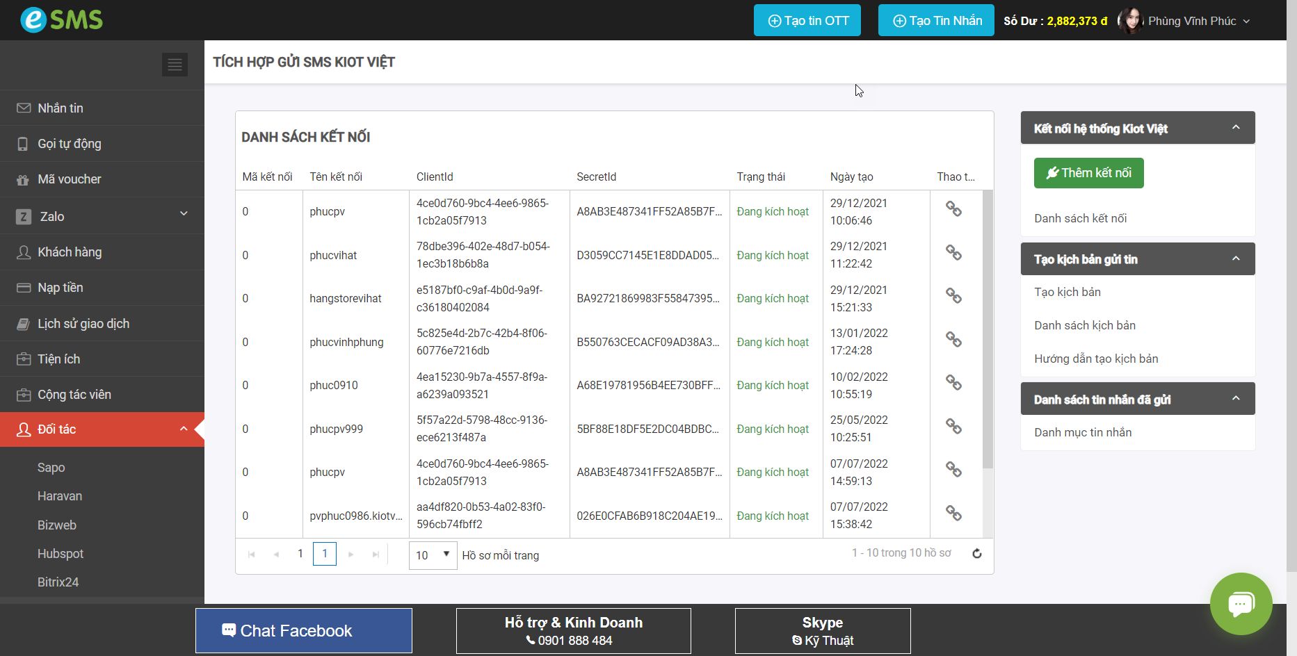 Bước 2: Đăng nhập vào tài khoản eSMS đã liên kết -> Tab "ĐỐI TÁC" -> Chọn KIOT VIỆT.