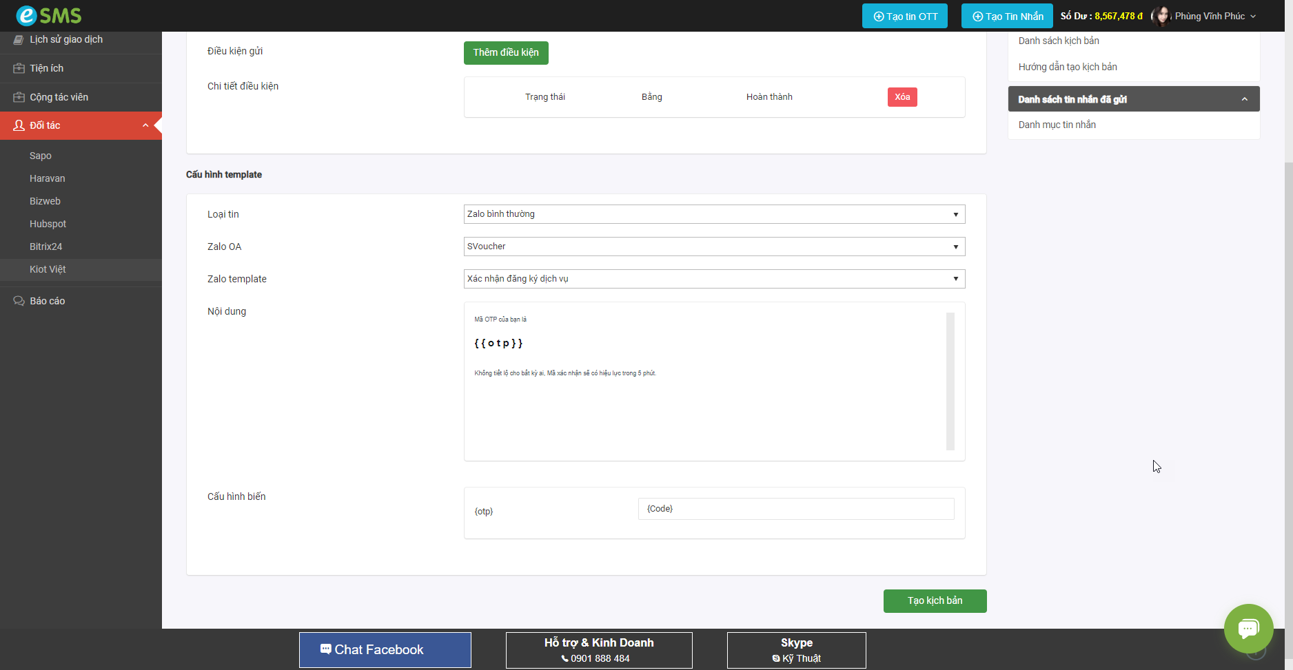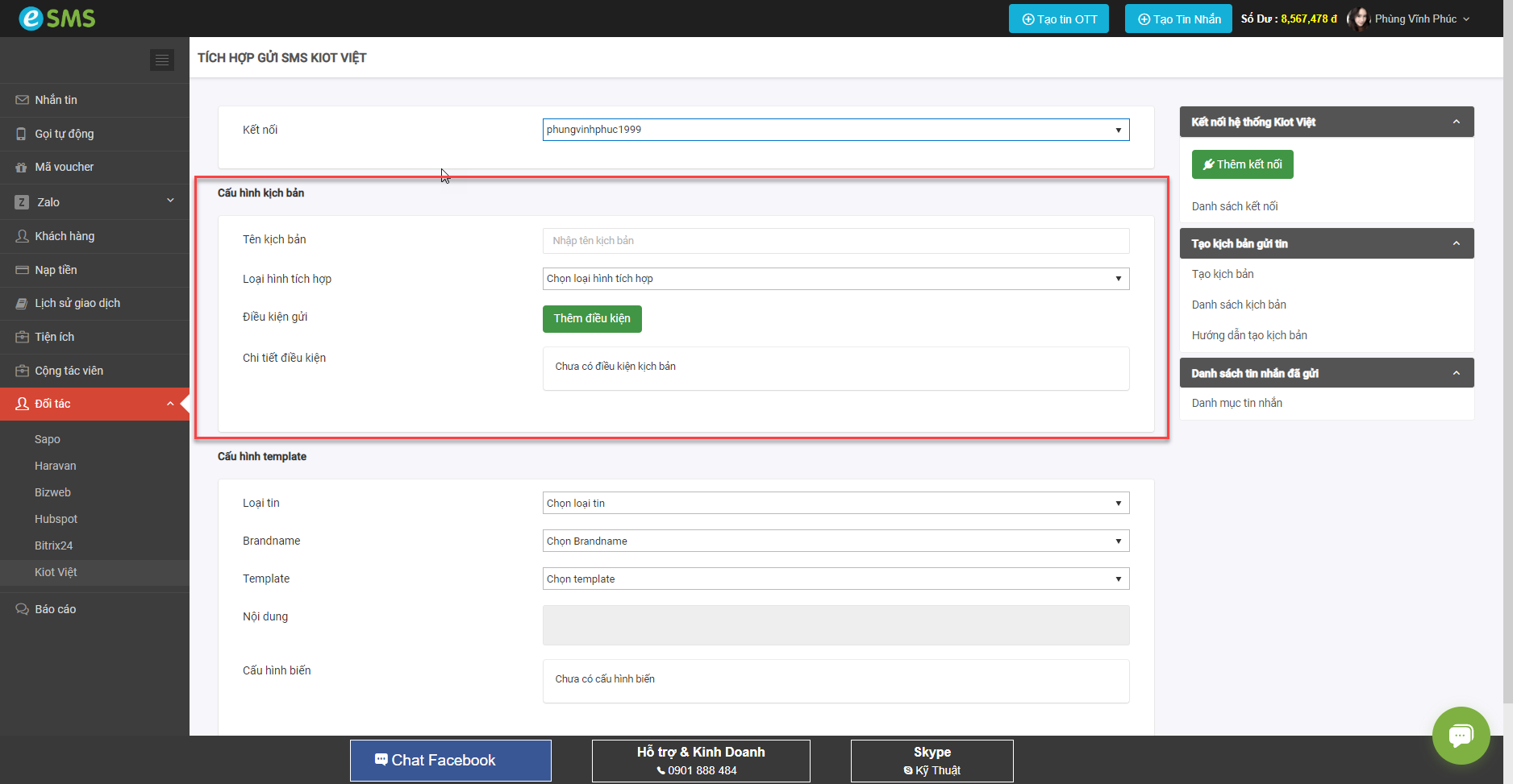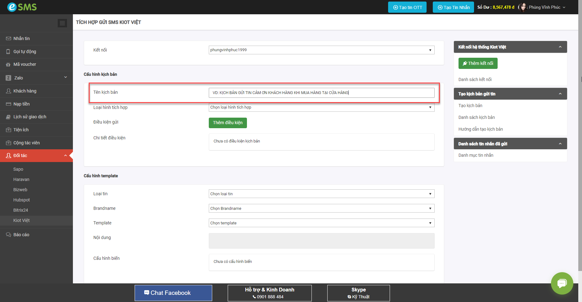 Sau khi nhấn "TẠO KỊCH BẢN" thì sẽ hiển thị ra màn hình TÍCH HỢP GỬI SMS KIOT VIỆT.