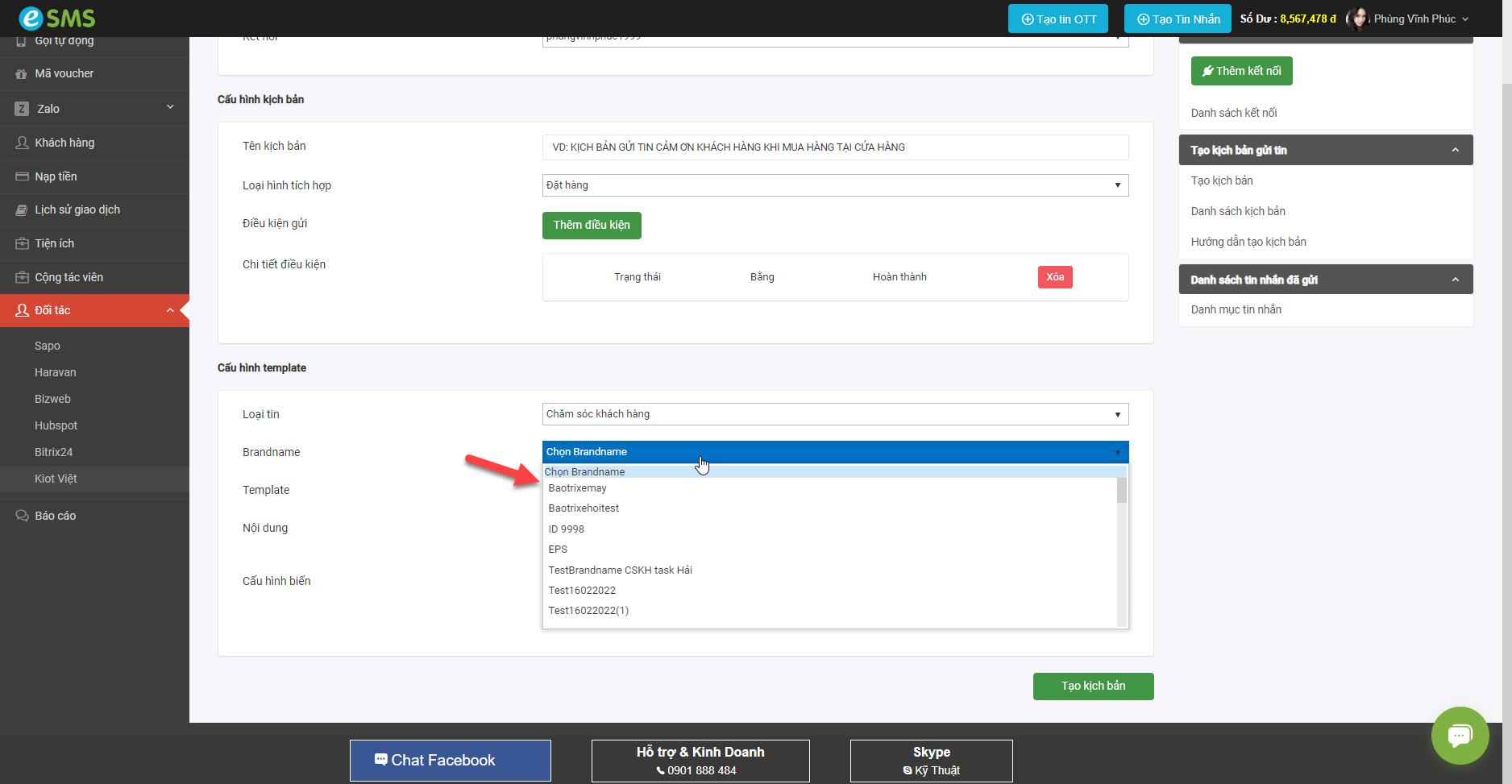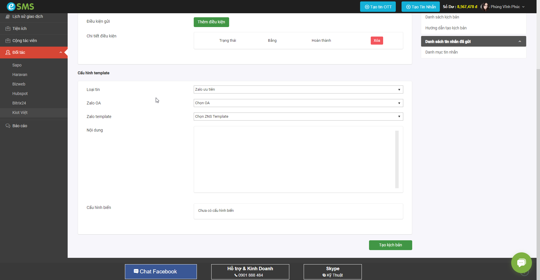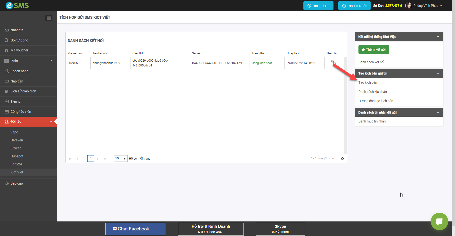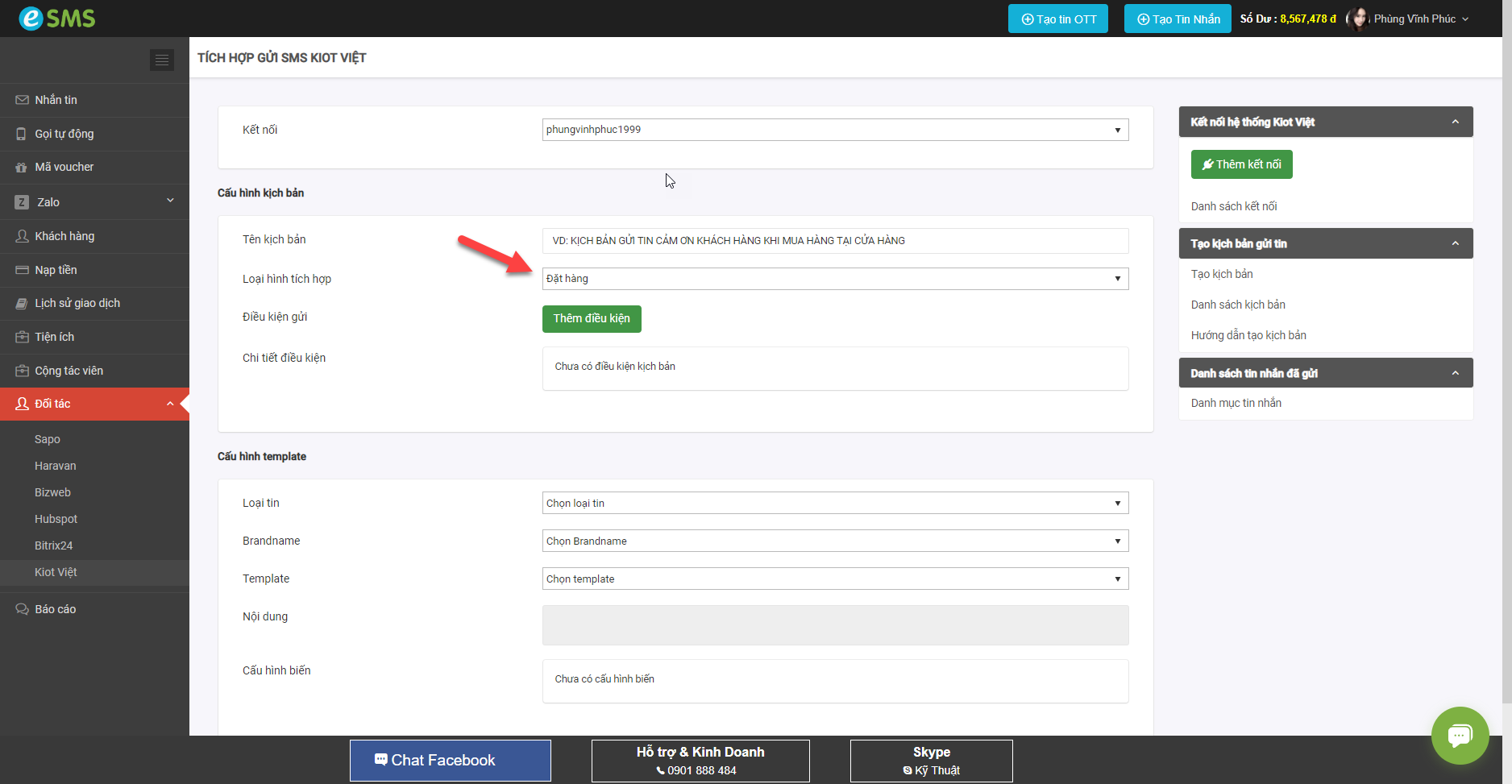 Sau khi nhấn "TẠO KỊCH BẢN" thì sẽ hiển thị ra màn hình TÍCH HỢP GỬI SMS KIOT VIỆT.