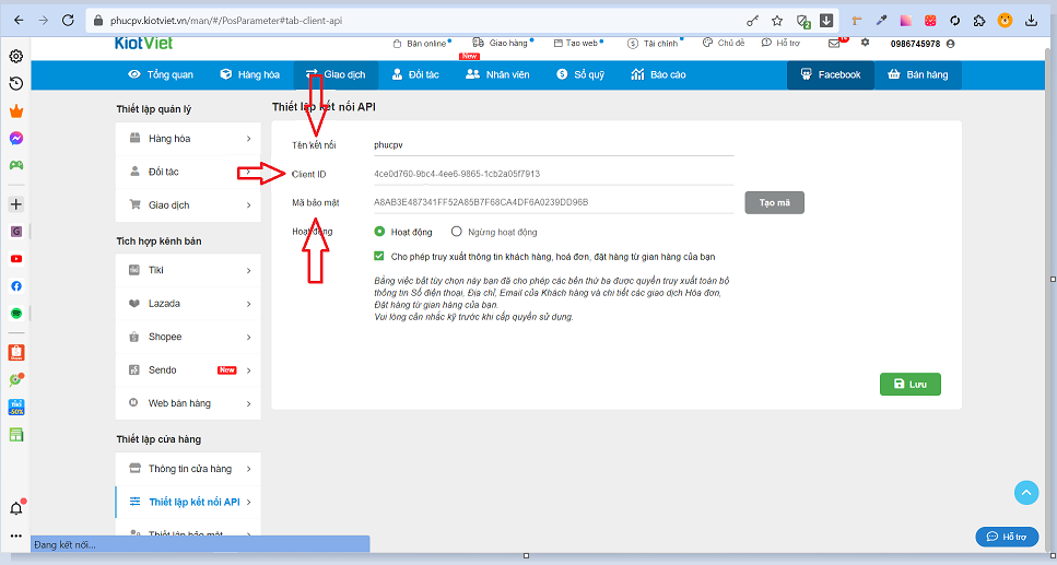 Bước 2: Lấy các thông tin kết nối ở cửa hàng Kiot Việt bao gồm: Tên kết nối, ClientID, Mã bảo mật