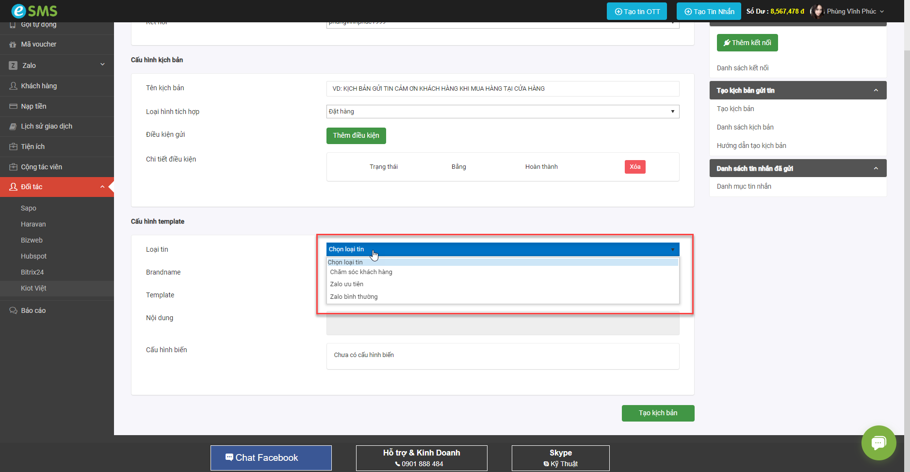 CÀI ĐẶT KỊCH BẢN TIN NHẮN KIOTVIET