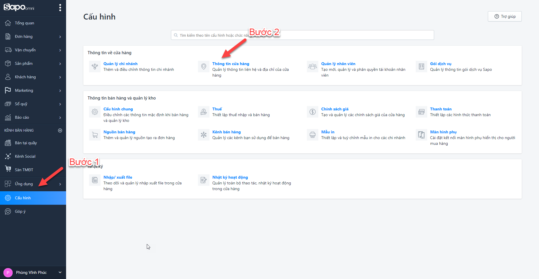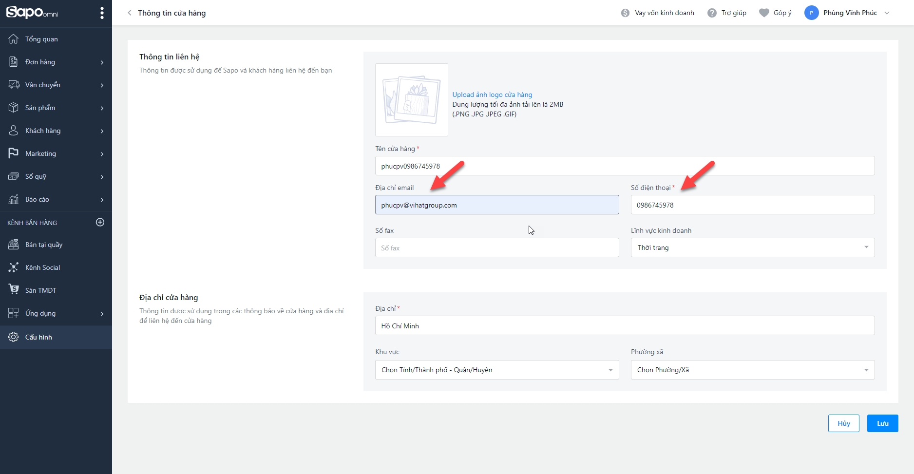 Bước 1: Vào cửa hàng SAPO -> Cấu hình -> Thông tin cửa hàng