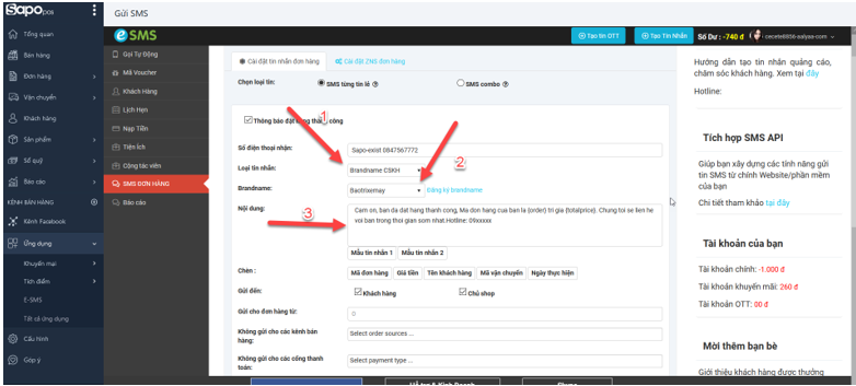 Số 1, số 2 và số 3 (trên hình) là 3 bước cần phải có để có thể cấu hình gửi tin: chọn Loại tin nhắn, chọn Brandname và nhập nội dung đã đăng ký template.