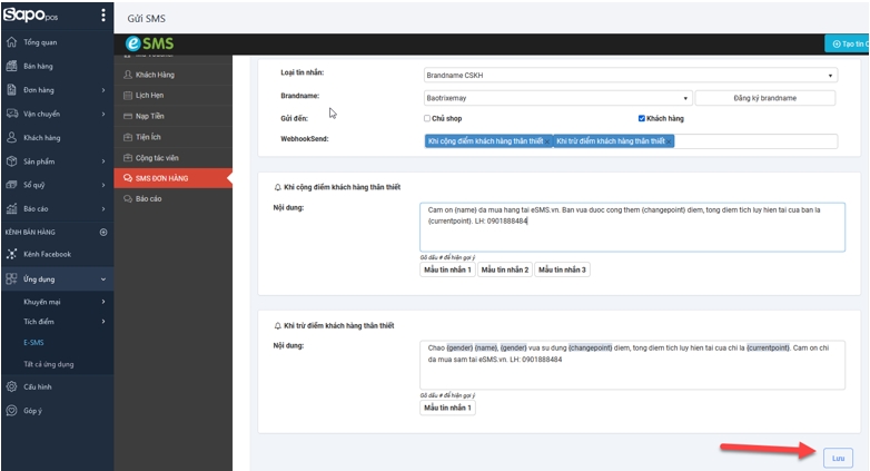 Bước 3: Khi đã cấu hình xong bạn bấm Lưu là đã hoàn thành xong cấu hình tin nhắn tích điểm.