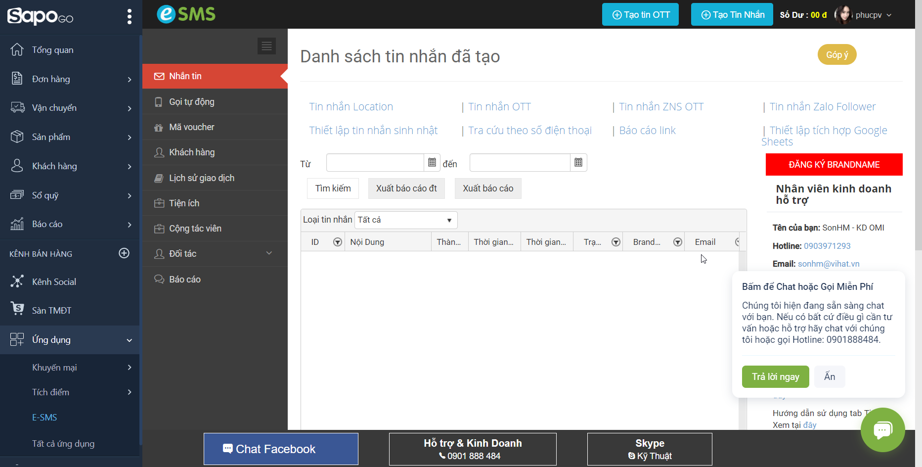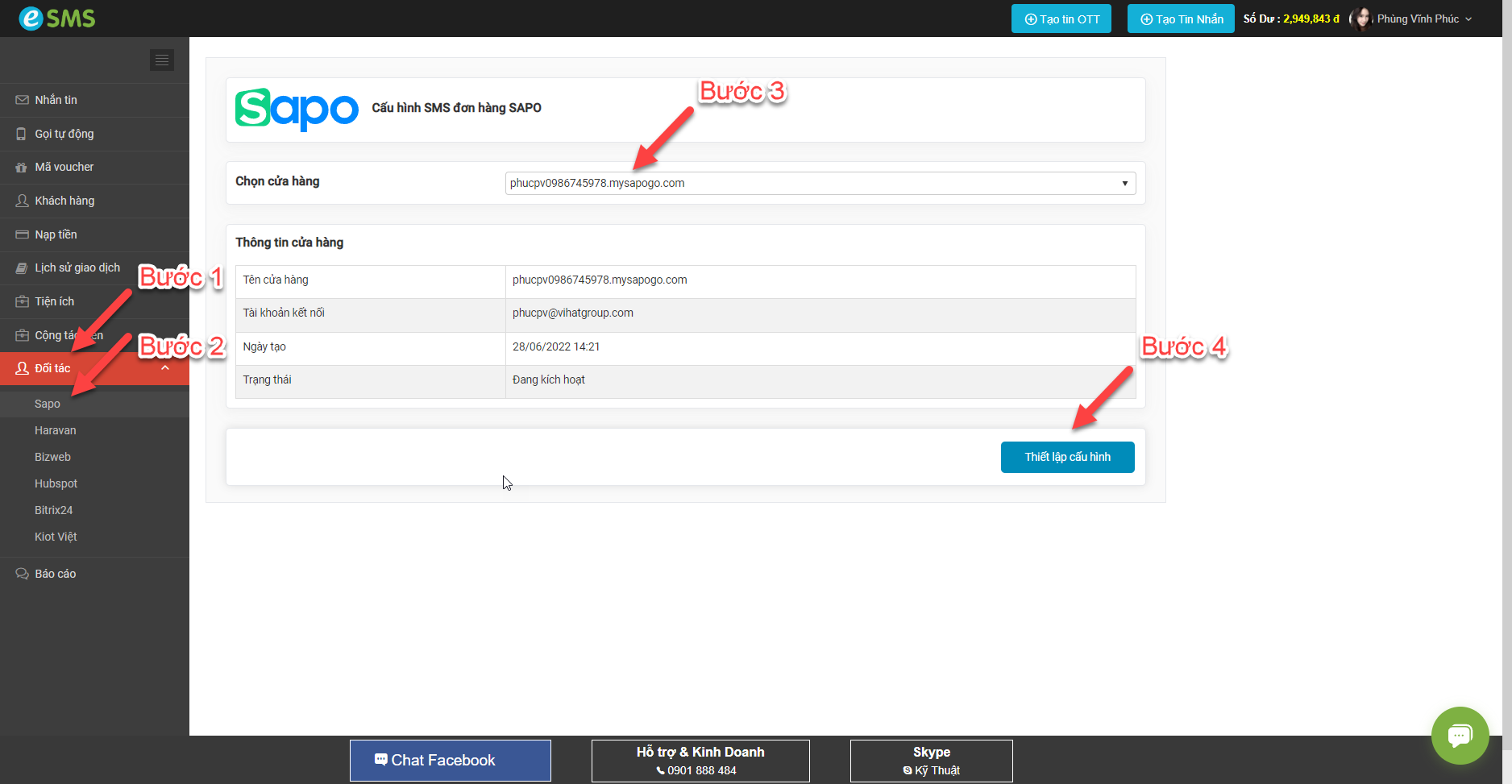 Bước 2: Đăng nhập vào tài khoản eSMS đã liên kết -> Vào phần ĐỐI TÁC -> Chọn SAPO -> Chọn cửa hàng cần thiết lập kịch bản -> Bấm THIẾT LẬP CẤU HÌNH.