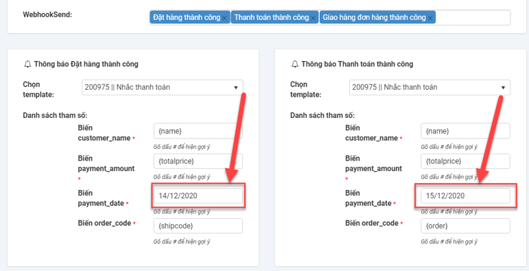Hiện tại chỉ có 7 biến mặc định là {gender}, {name}, {totalprice}, {shipcode}, {datenow, {order}, {product_name}: khách muốn thêm biến nào thì liên hệ với kỹ thuật để code thêm biến đó. Những biến đã đăng ký nhưng không khớp với biến mặc định thì khách có thể nhập luôn nội dung cố định vào (không được để trống).