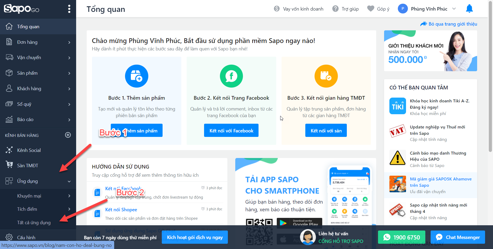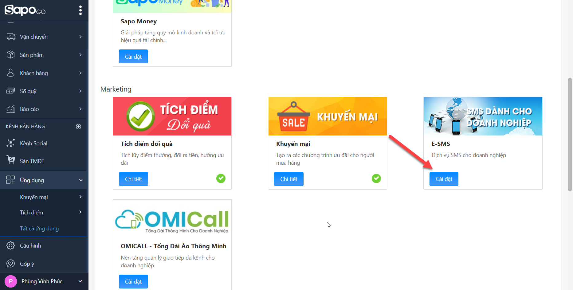 Bước 1: Vào cửa hàng SAPO -> Chọn ỨNG DỤNG -> Chọn TẤT CẢ ỨNG DỤNG