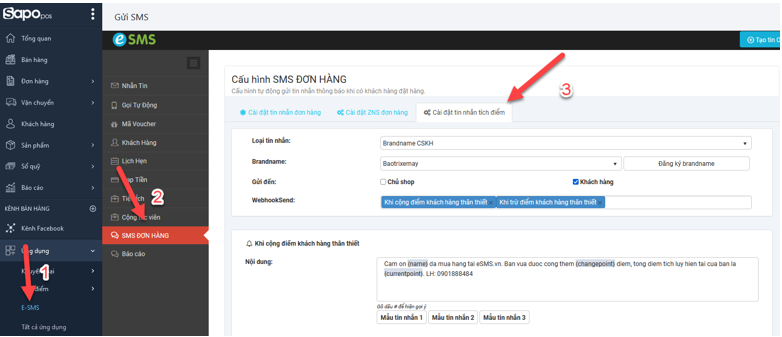 Bước 2: Sau khi tài khoản SAPO đã có kết nối với eSMS, bạn vào phần SMS Đơn hàng -> Cài đặt tin nhắn tích điểm.